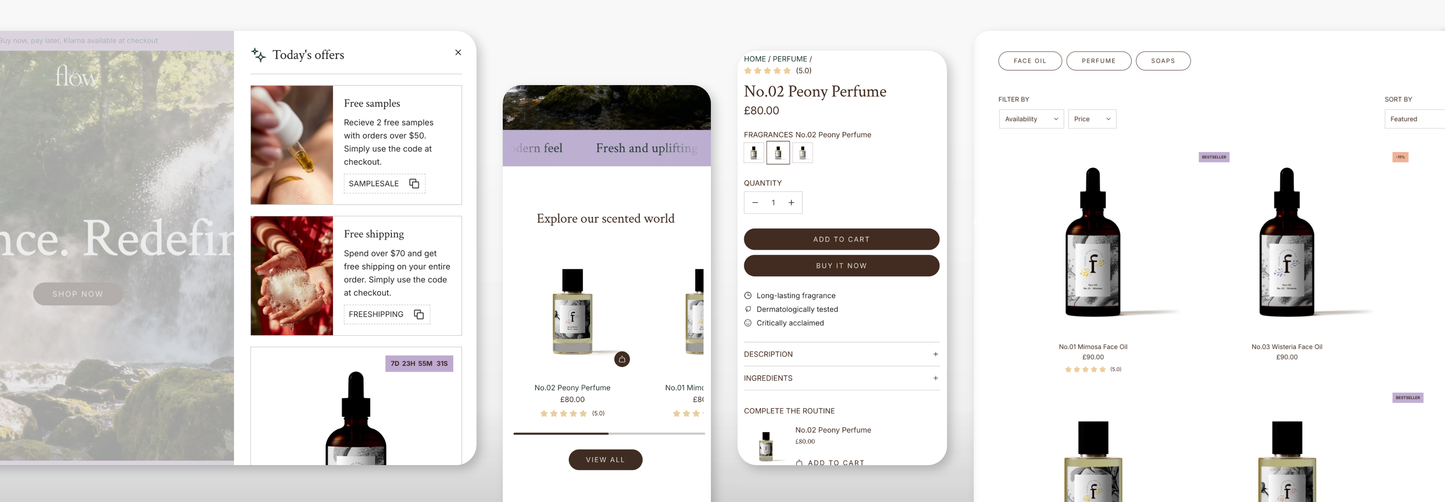 | Offers drawer | Boost conversions with an engaging offers drawer, allowing you to showcase unlimited promotions, discount codes, exclusive deals, and even feature a specific product for direct promotion. Designed to capture attention and drive sales, it provides a seamless way to highlight time-sensitive offers, free shipping perks, or seasonal discounts. | |
